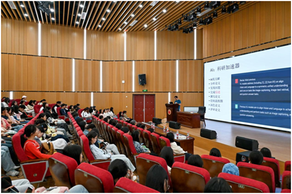 本网讯(图书馆 李小明)为深化全民阅读,推动科普阅读与前沿科技深度融合,4 月 25 日上午,晨夕读书第十六期读书分享会在求实楼多功能厅 B301 圆满举行。本次分享会特邀复旦大学张军平教授以《人工智能的边界》为主题,为全校师生带来一场兼具理性思辨与人文温度的 AI 科普盛宴。活动由图书馆联合信息科学与工程学院共同举办,首届开慧实验班全体学生及校内人工智能爱好者共150余人参与。